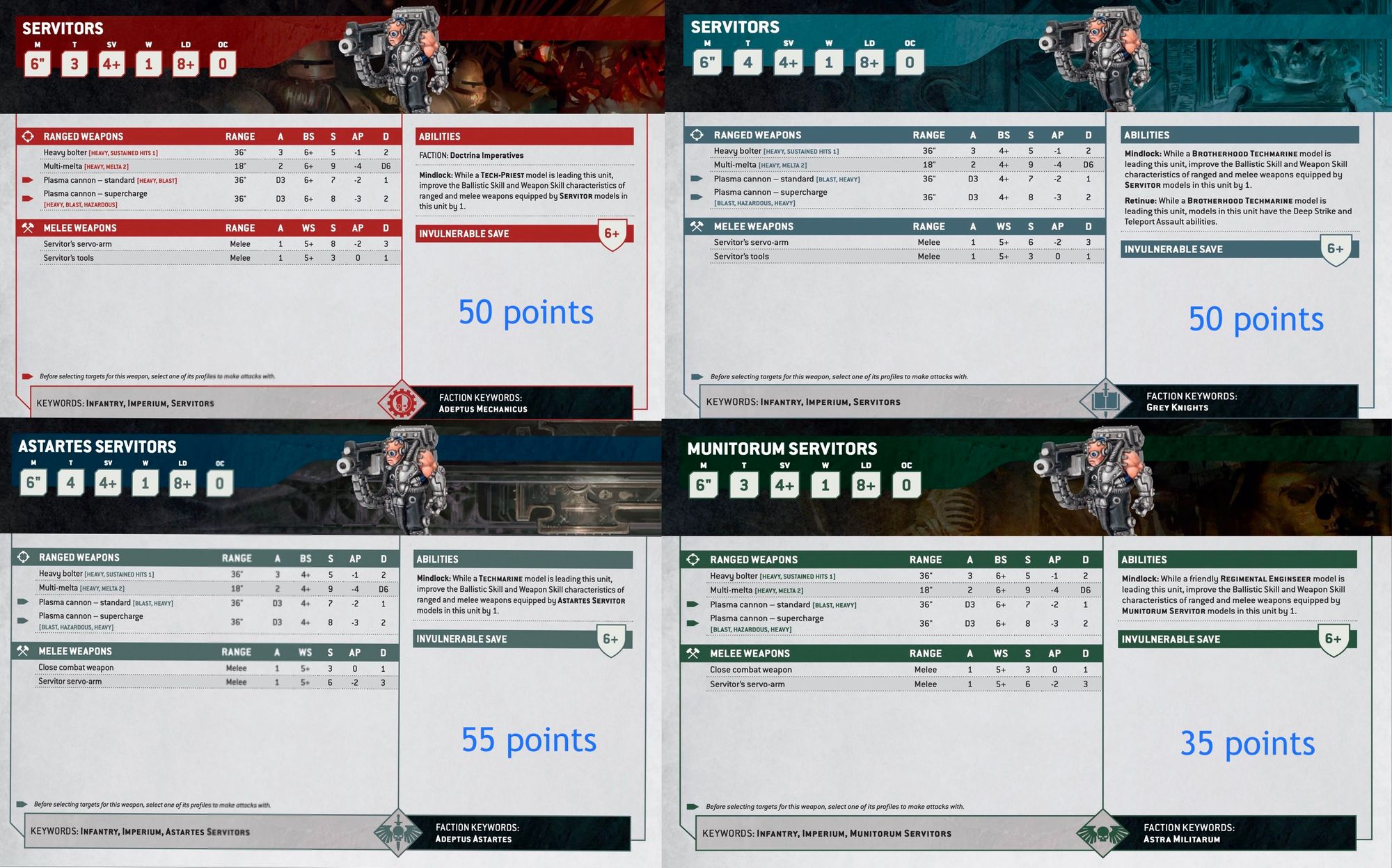 Think again. I've put together a visual that shows the points costs and abilities of all the servitors in the imperium, including those from the Space Marines, Grey Knights, and Astra Militarum indexes. When led by a Techmarine, both the Astartes and Grey Knight servitors get buffed from a 4+ to a 3+ ballistic and weapon skill. AdMech servitors? Their BS/WS improves from a lowly 6+ to a 5+.