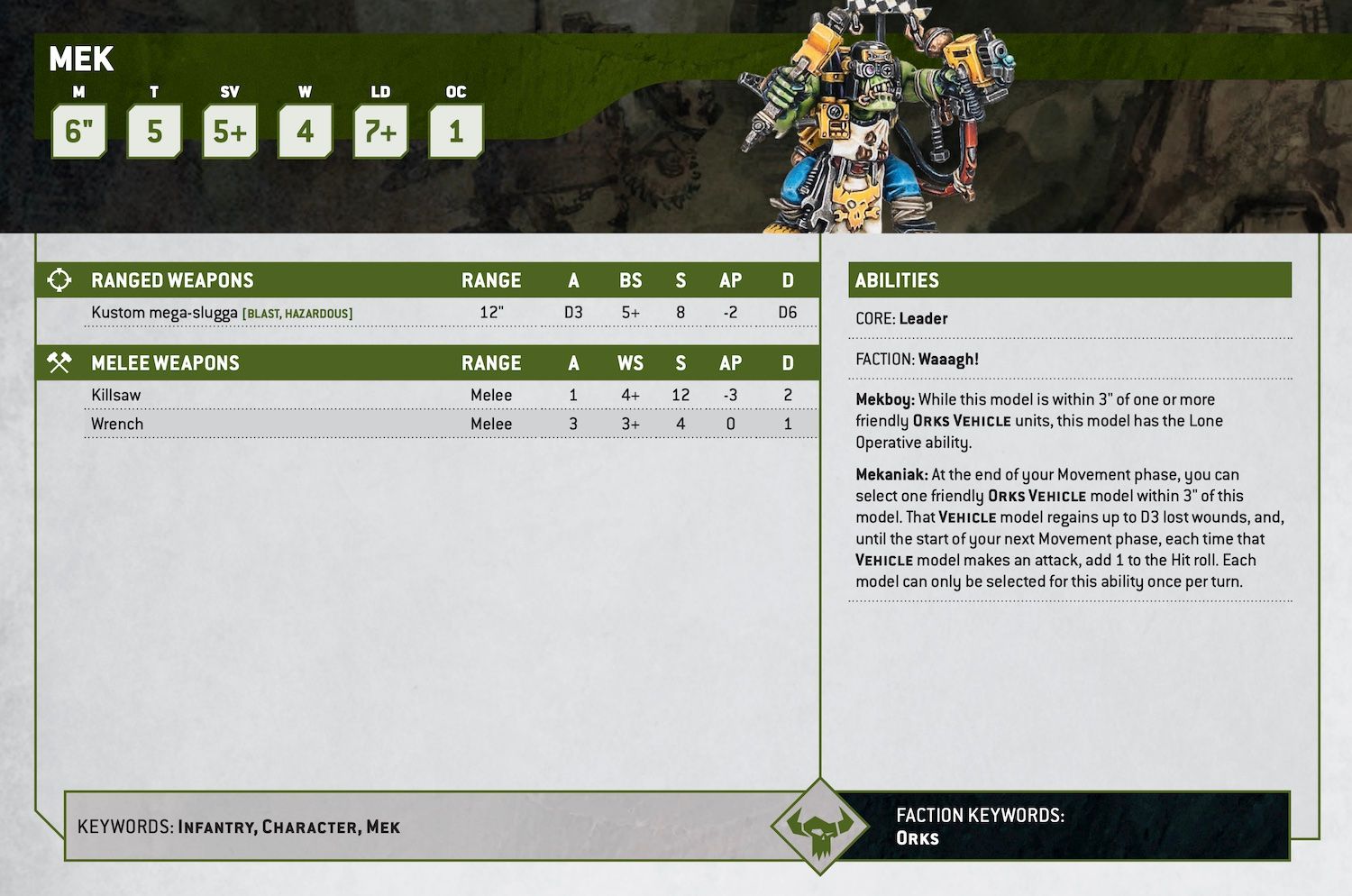 Even a lowly Ork Mek (45 points) can become a greenskin MacGyver and use scrap metal, Grot snot, and Squigosaur toenails to heal D3 wounds and give +1 to hit on a vehicle within 3". He also gets the Lone Operative ability within 3" of a vehicle, has decent shooting and melee weapons, and can take advantage of the Ork Waaagh! army rule.