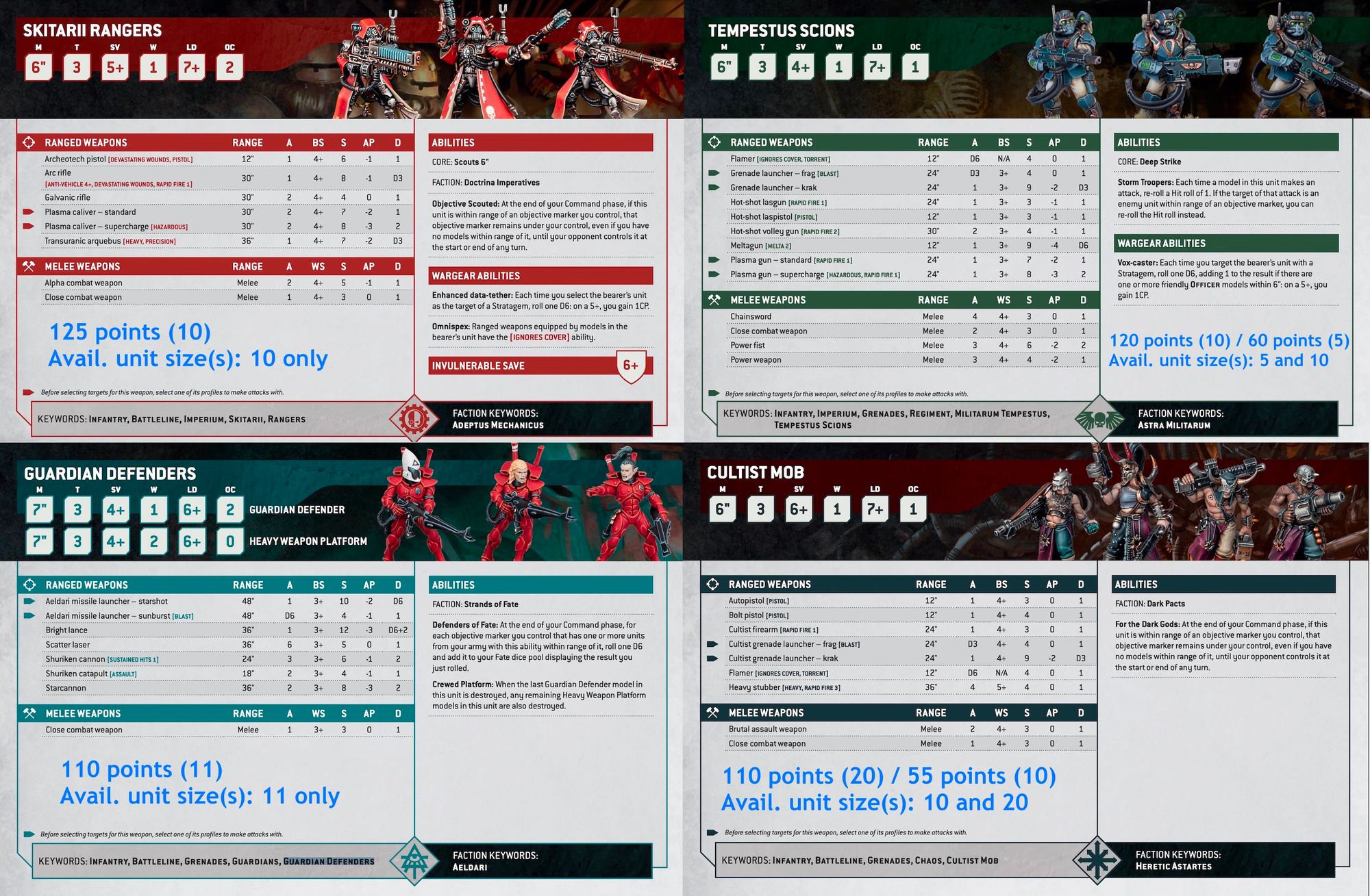 These aspiring cultists have the same shooting ability (BS4+) and a nearly identical statline—other than a slightly weaker save (6+ vs 5+/6++) and lower OC value (OC 1 vs OC 2)—as our augmented, enhanced, and armor-plated Skitarii legions. But wait! The humiliation of our beloved Rangers isn't complete: Unlike Skitarii, these Cultist Mobs have the tactical acumen to organize themselves in units of 5. Or in riotous mobs of 20. They're also only 55 points for 10 models, and a meager 110 points for 20. They also have a similar sticky obsec ability, which was likely a key selling point in the "Chaos needs you!" promotional literature that swung their allegiance to the ruinous powers.