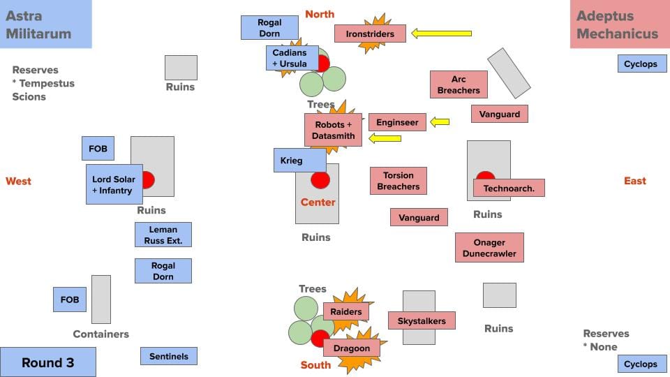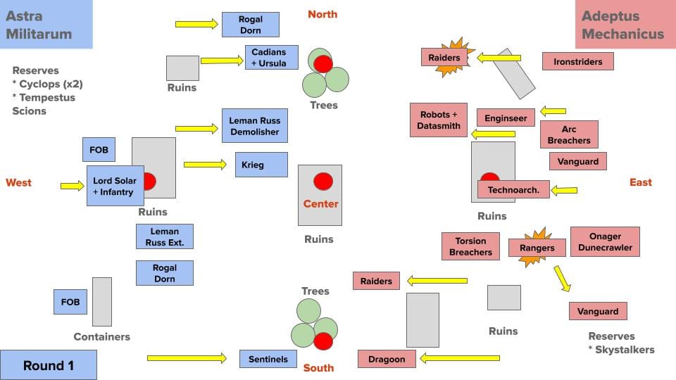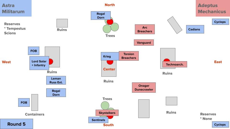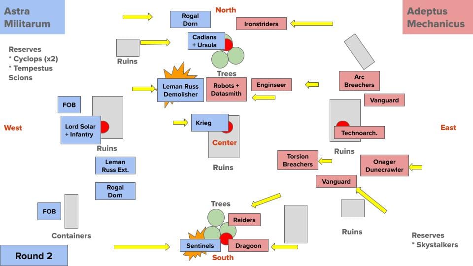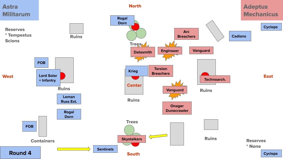 A Rogal Dorn rumbles towards the top objective to support Creed and her troops, while farther south, the Leman Russ Demolisher parks itself between the clump of trees surrounding the north objective and the ruins surrounding the central objective. Farther south, a unit of two scout sentinels lope onto the south objective, performing cleanse and aiming their guns at the Mechanicus units on the horizon.