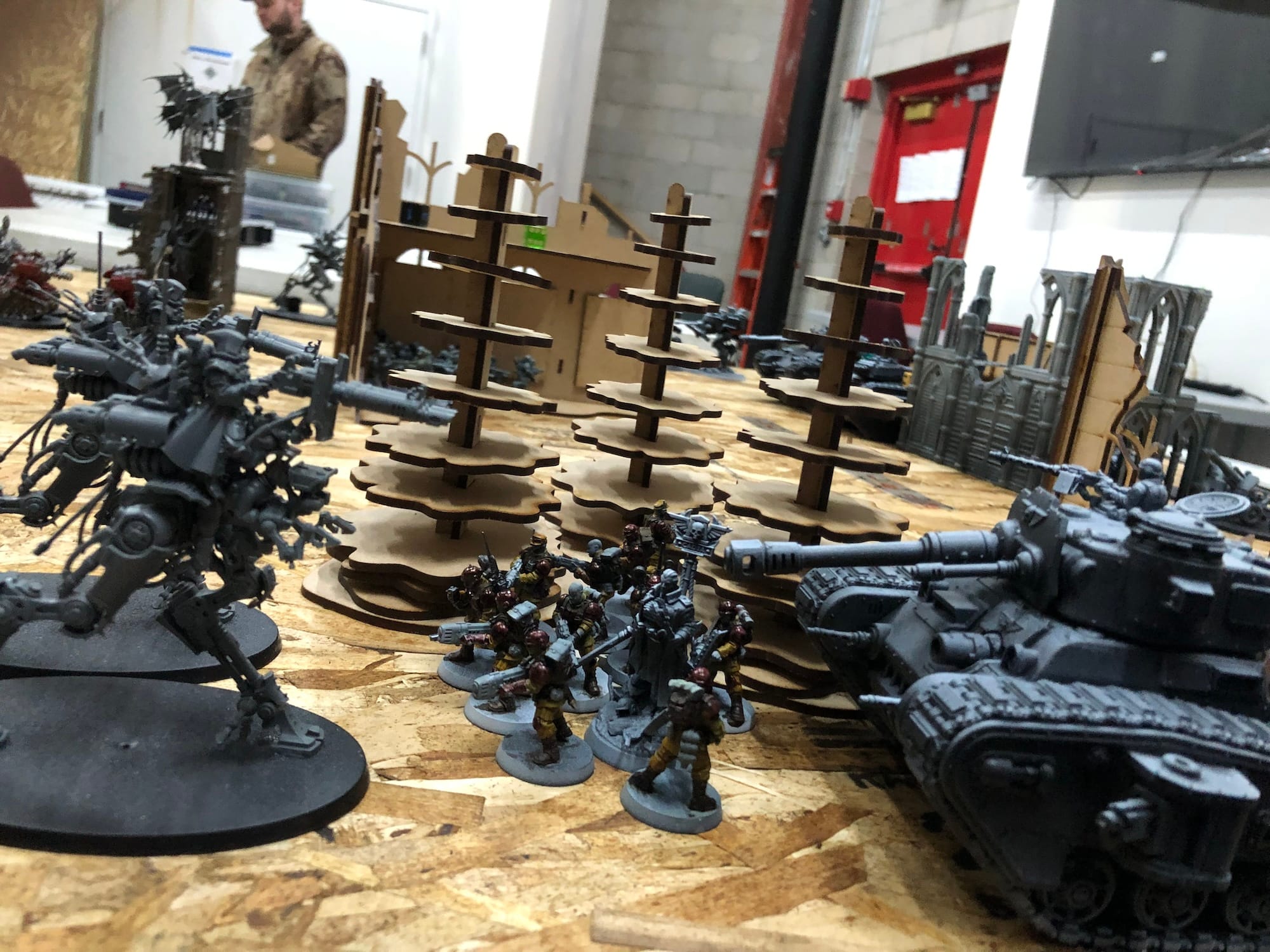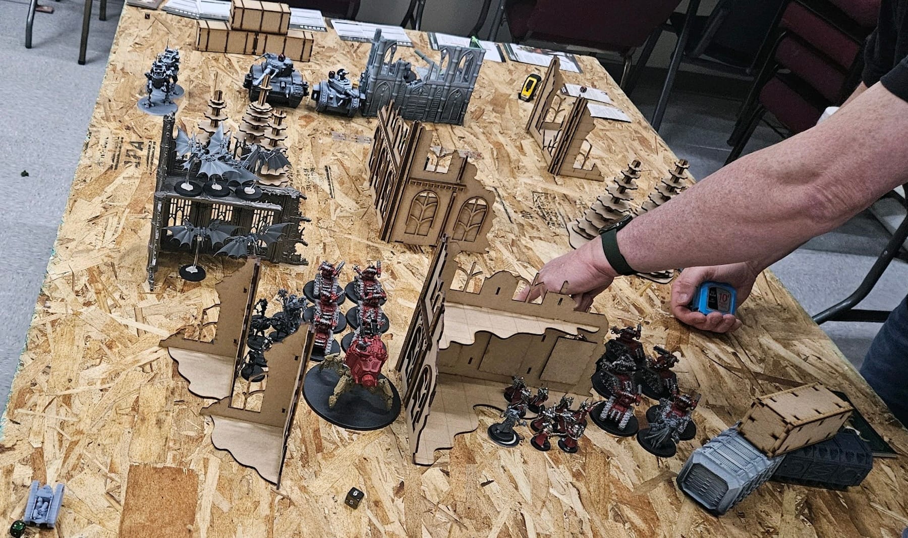 Mistakes you made? "My rookie deployment decisions weren't very good: My Breachers with Torsion Cannons (good vs. infantry) were far away or blocked by terrain from shooting Trevor's infantry on the center objective, and my Breachers with Arc Rifles were maneuvering around terrain to get visibility on Trevor's tanks for most of the game. Both units of Breachers (and their Skitarii support units) made my deployment zone very crowded, which forced my Onager Dunecrawler to sit in the backfield waiting for traffic to clear for most of the game. In hindsight I should have put the Onager in reserves along with the Skystalkers."